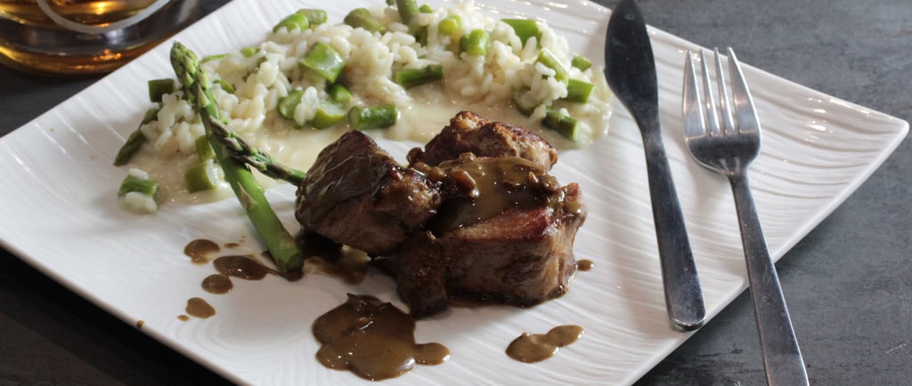 Nous vous proposons une alliance gourmande entre le filet mignon et le Pineau Maison Beaumont Blanc pour accompagner le risotto aux asperges.